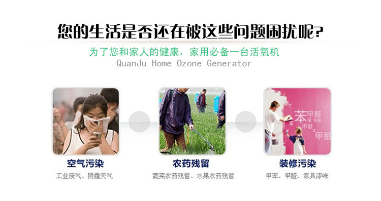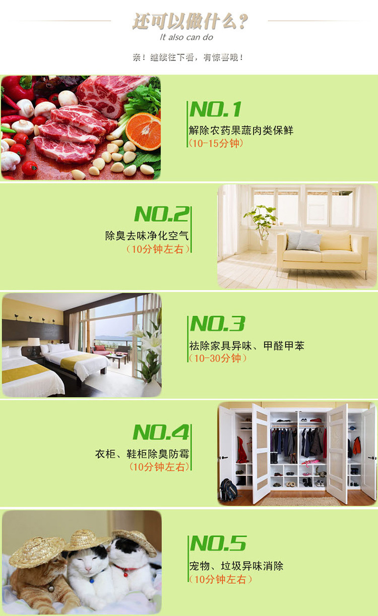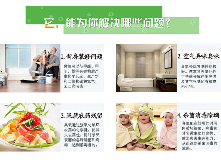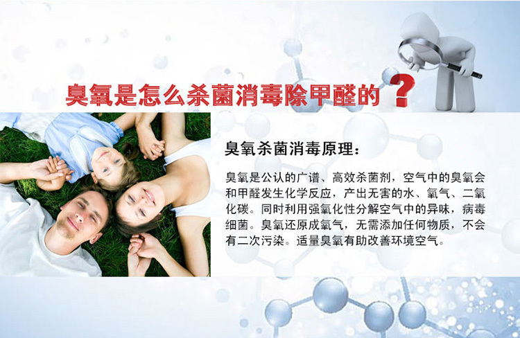6、新居室、家具除味:裝飾材料中的化工劑會(huì)揮發(fā)出有毒氣體甲苯、甲醛,臭氧的強(qiáng)氧化性能在10分鐘內(nèi)消除3年才能完全揮發(fā)的有害化學(xué)物質(zhì)。讓您輕松享受 雨后森林般的清新空氣)。分解新裝修房間的甲醛,苯等有害化學(xué)物質(zhì),保證空氣清新。
