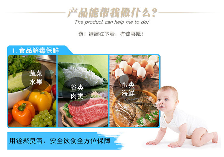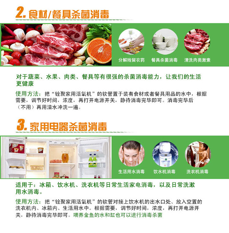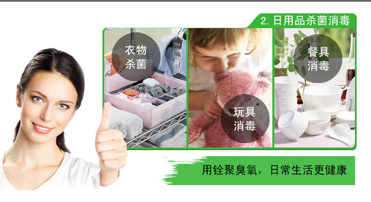 1、餐具消毒:清洗過后的餐具再用活氧水浸泡,可殺滅乙肝病毒,達(dá)到完全滅菌的作用,并無消毒劑殘留,是您健康的理想保障。